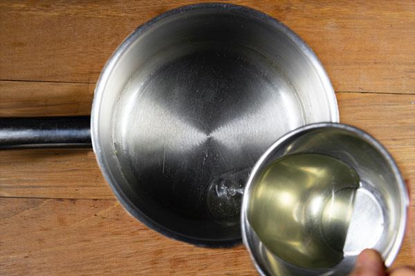 En una cazuela derretiremos el aceite de coco y una vez se haya derretido por completo, añadiremos el agua y removeremos.