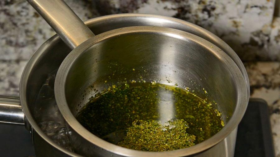 Después mezclamos la marihuana con los 150 ml de aceite de oliva y lo ponemos a calentar al baño maría, es decir, en una cazuela ponemos agua a calentar a fuego medio – sin permitir que llegue al punto de ebullición -, y sobre esa cazuela pondremos un tarro o recipiente que permitan calentar el aceite de oliva.