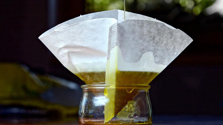 Cuando haya pasado el tiempo, filtraremos el aceite de marihuana con la ayuda de un colador de tela o filtro de café.