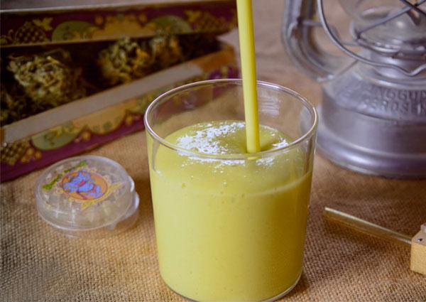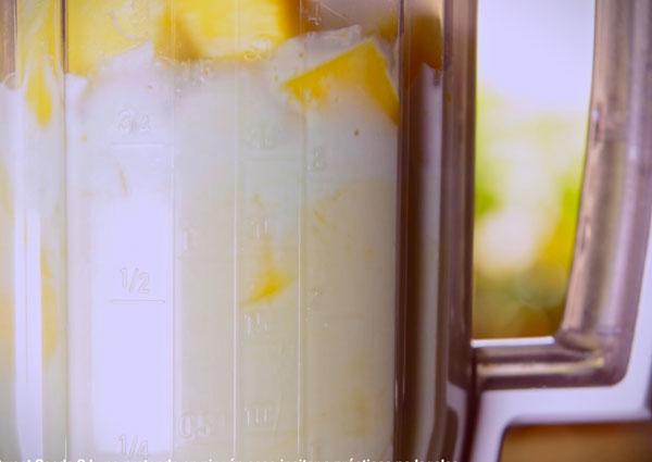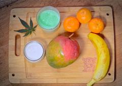 En una licuadora o batidora vierte el zumo de mandarina,la Leche de marihuana bien fría, el yogurt, el plátano y mango ya troceados. Y lo procesaremos hasta que quede todo bien mezclado y no se observen trozos de fruta.
