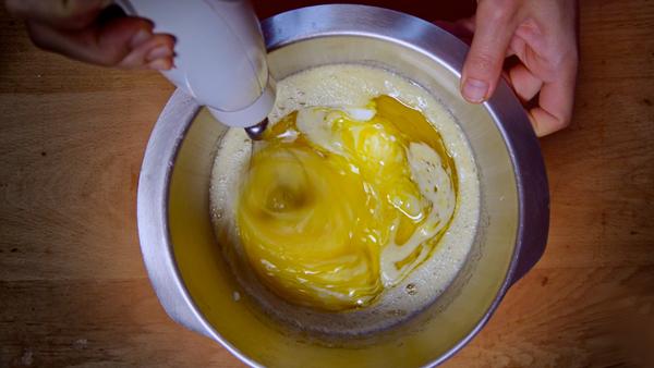 Ahora bien, en un bol aparte, pondremos los huevos y dos medidas de azúcar, los batiremos muy bien. Ahora añadimos el aceite cannábico y el yogurt que teníamos reservado y seguimos batiendo hasta que quede todo integrado.