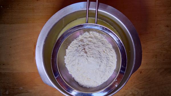 Tamizaremos tres medidas de harina y la levadura seca con la ayuda de un colador. Y mezclaremos ambos ingredientes con la mezcla de liquida, batiremos continuamente hasta que quede una masa homogénea.