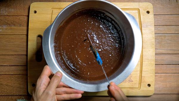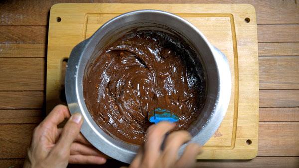 Ahora añadiremos el chocolate y mantequilla cannábica previamente derretidos y mezclaremos con la ayuda de unas varillas.