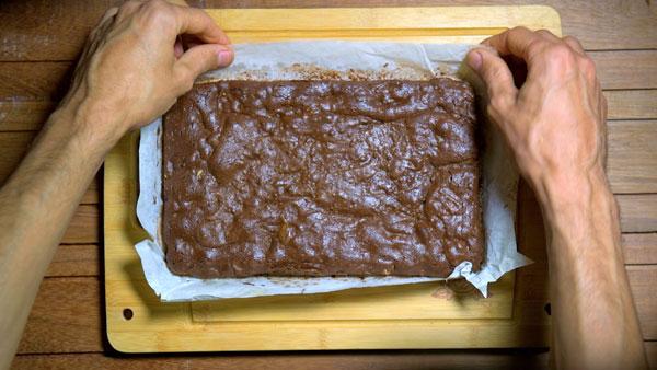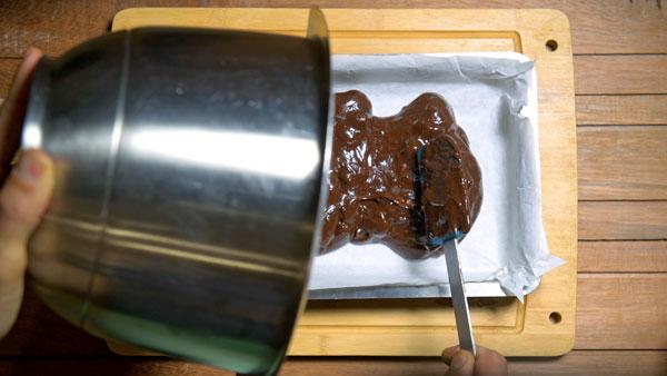 Engrasaremos el molde para el horno o cubriremos con papel para hornear y verteremos nuestra mezcla de brownie cannábico.