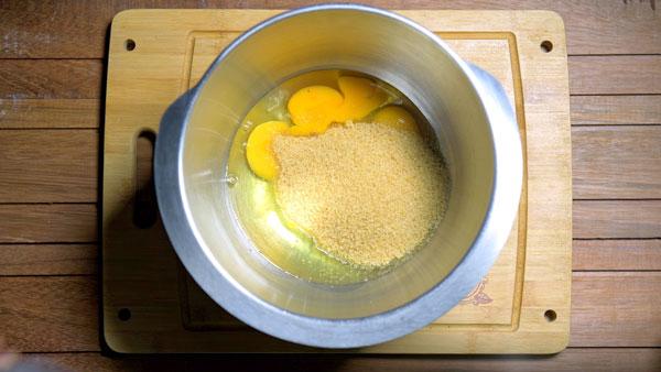 En el bol grande echaremos los 3 huevos y el azúcar y lo batiremos todo enérgicamente hasta que el azúcar se haya diluido por completo.