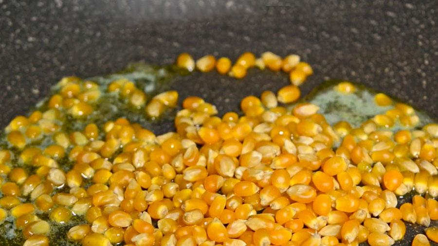 Una vez este caliente la mantequilla, añadiremos el maíz y taparemos la olla para conservar el calor y evitar que las palomitas salgan volando.