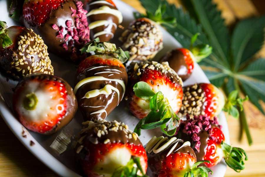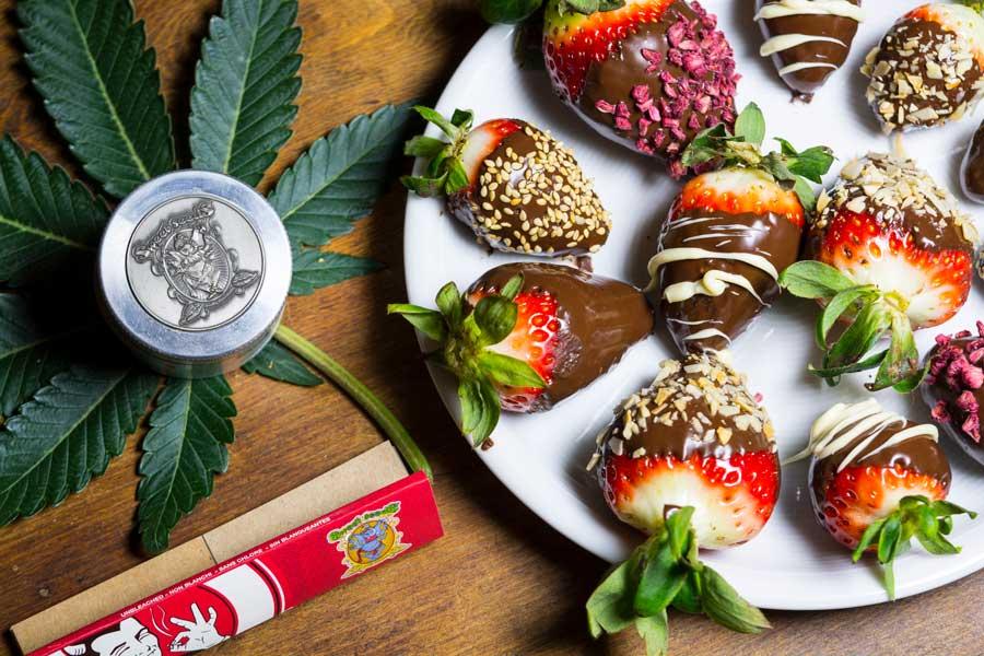 Una vez fundido el chocolate con la Cannabutter, sosteniendo las fresas por el tallo, sumergiremos una a una en la mezcla de chocoweed, aproximadamente tres cuartos de la fresa hasta el tallo y las dejaremos reposar sobre una superficie lisa.