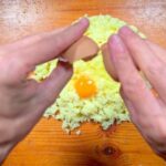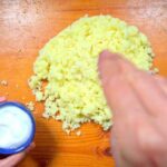 Cuando el puré está templado, en el mismo bol añadimos el huevo, una pizca de sal y mezclamos bien.