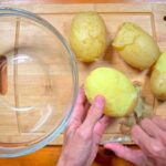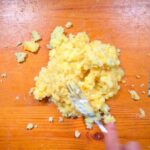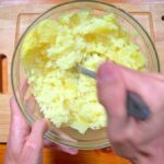 Como primer paso pelamos las patatas y las ponemos a hervir en abundante agua. Cuando las patatas están listas las escurrimos con un colador y las trituraremos en un bol con la ayuda de un pasapuré o un tenedor. Dejamos enfriar el puré que se formó.