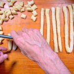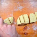 Una vez que tenemos la masa lista, con las manos enharinadas, dividiremos la masa en porciones para trabajarla con facilidad. En la mesa donde esté trabajando, llena la superficie de harina y estira cada porción formando un cilindro. Con un cuchillo corta porciones de entre 1.5 o 2 cm.