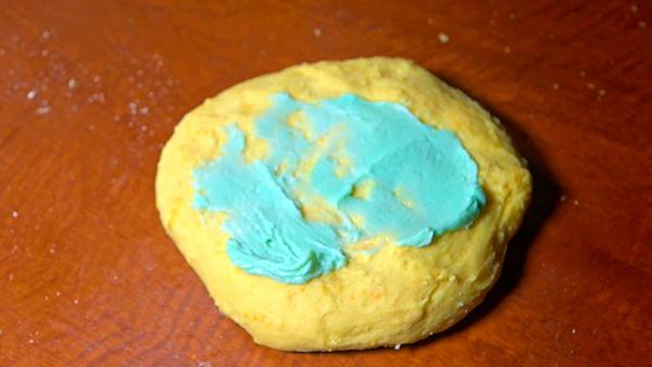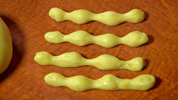 Con las cuatro porciones de 20 gr haz bolitas con cada una de ellas, y tendrás que darles la forma de los huesitos como se muestra en la foto