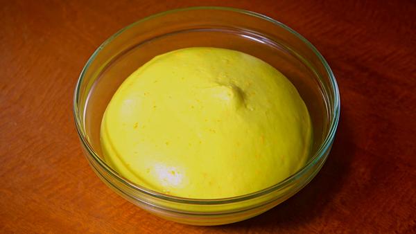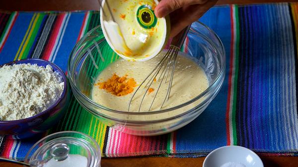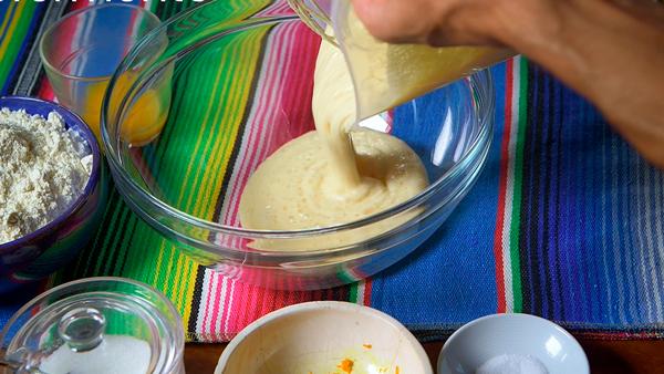 Colocaremos en un recipiente grande el pre-fermento y agregaremos la ralladura de naranja, el azúcar, la yema de un huevo y lo removeremos muy bien.