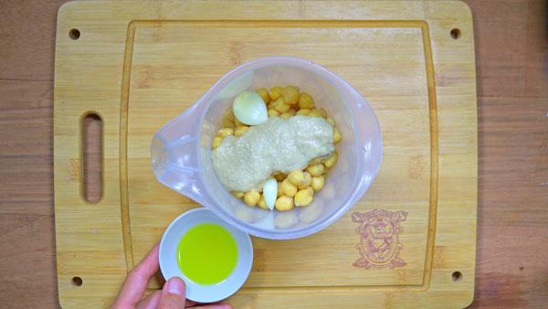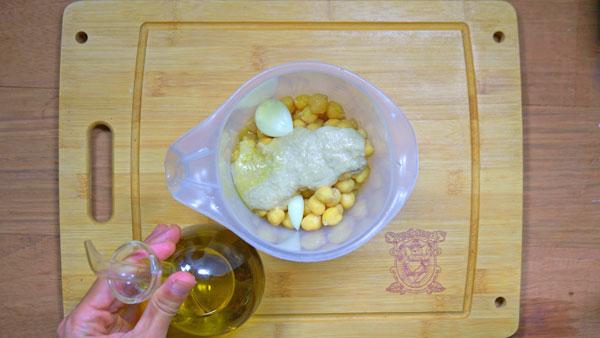 Una vez tengamos bien mezclados el limón y el tahini (pasta de sésamo), añadiremos los 400 gr de garbanzos cocidos, los dos dientes de ajo, el aceite cannábico, el aceite de oliva, las dos cucharadas de agua y el comino y volveremos a procesar hasta que quede una masa fina.