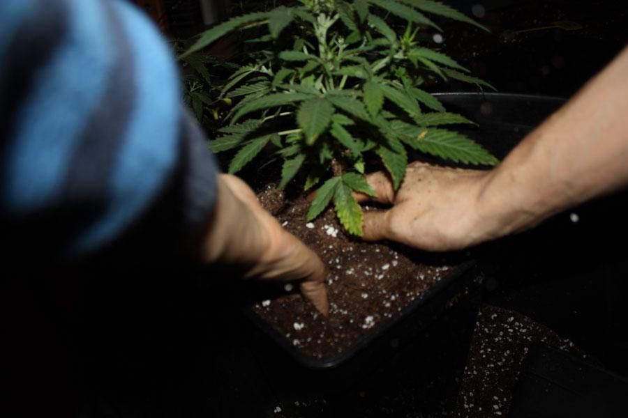 Una vez tenemos preparado y desinfectado todo el material necesario, prepararemos la nueva maceta donde se va a trasplantar la planta de marihuana. Tendremos que llenarla con un buen sustrato, aproximadamente hasta la mitad del recipiente, el cual presionaremos ligeramente para así obtener una buena consistencia para las raíces.