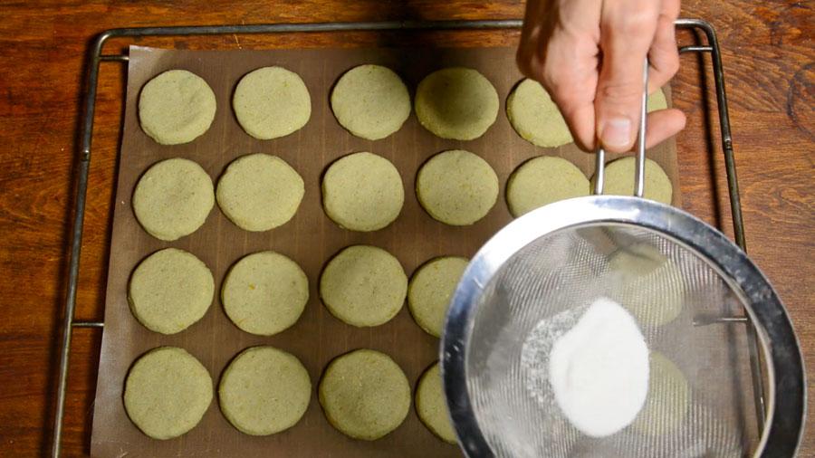 Ahora sacamos la bandeja y con ayuda del tamizador, espolvoreamos el resto de azúcar glass sobre los polvorones de marihuana aún calientes.