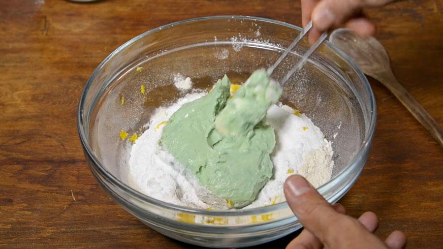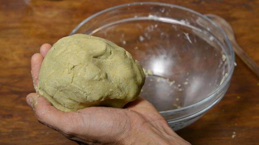 Una vez cocinada, la tamizaremos para evitar que queden grumos y dejaremos enfriar. Una vez fría la harina haremos un volcán y en el centro incluiremos la manteca de marihuana a punto de pomada y la ralladura de limón, las almendras bien trituradas, la canela y 300 g de azúcar glass. Hay que reservar unos 50 g. de azúcar glass para la decoración.