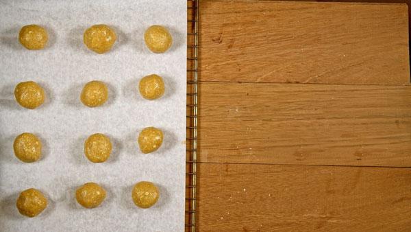 Con la masa de galletas Do-si-dos cannábica ya lista, prepararemos bolitas con la masa y las iremos colocando en la bandeja de horno, que previamente habremos cubierto con papel para hornear. Recuerda dejar espacio entre ellas, ya que luego se extenderán.
