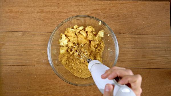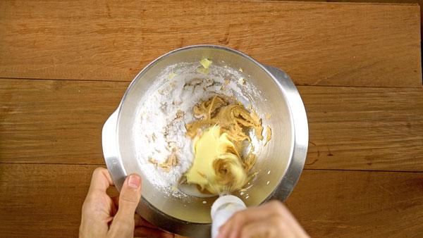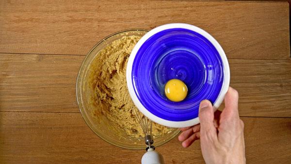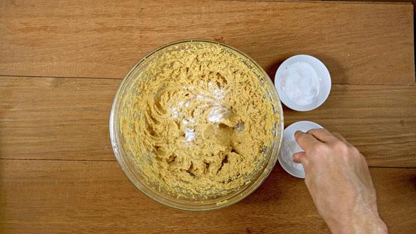 Ahora añadiremos el huevo, la vainilla y volveremos a batir hasta que quede bien integrado. Luego añadimos la sal y el bicarbonato de sodio y batimos hasta incorporar bien todos los ingredientes.