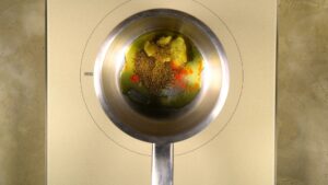 7- En una sartén calentamos el resto de Aceite de oliva virgen extra (10 ml) con la Mantequilla de marihuana (1 cucharadita por persona) y añadimos el comino, el chile (también puedes usar cayena) y dejaremos hasta conseguir un aceite aromático.