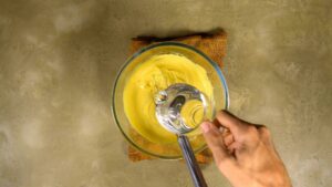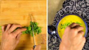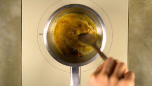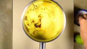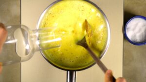Preparación de sopa india de yogur y cúrcuma (kadhi):