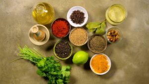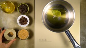 3- En una olla, calienta 15 ml de aceite de oliva virgen extra y añade todas las especias a excepción del comino, el chile y el pimentón.