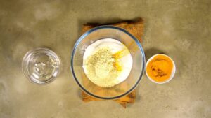 1- Para empezar vamos a colocar en un bol el yogur, la harina de garbanzos y la cúrcuma y mezclaremos muy bien con la ayuda de unas varillas.