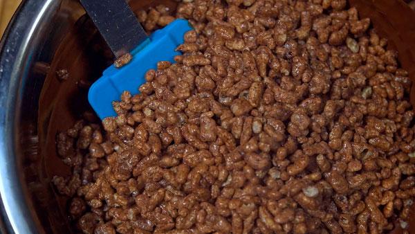 Cuando tengamos una mezcla homogénea, añadiremos el arroz inflado y volvemos a remover hasta incorporarlo por completo.