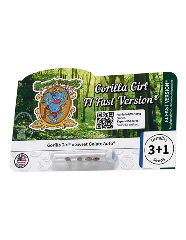Lichtabhängige, feminisierte und sehr schnell blühende Version der Gorilla Girl® (SWS74), die stärkste "Super Strong" Sorte im Sweet Seeds® Katalog, mit bis zu 31 % THC. Ergebnis der Kreuzung zwischen der kraftvollen Gorilla Girl® und unserer Sweet Gelato Auto® (SWS76).