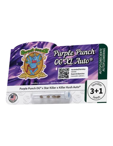 Autofloreciente de 5ª Generación. Versión autofloreciente de nuestra variedad Purple Punch OG® (SWS93). Resultado del cruce entre un clon élite seleccionado de Purple Punch OG® [Purple Punch (Larry OG x Grand Daddy Purple) x Star Killer (Skywalker OG Kush x Rare Dankness #2)] y nuestra apreciada variedad autofloreciente Killer Kush Auto® (SWS56).