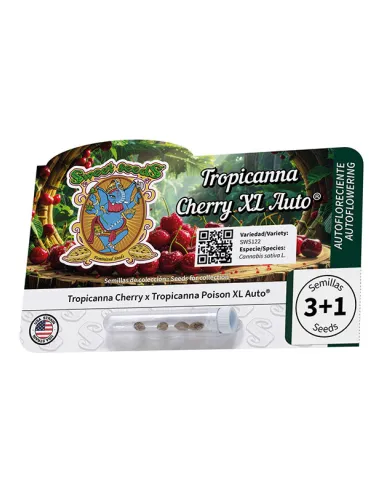 Tropicanna Cherry XL Auto® surge del cruce entre Tropicana Cherry y Tropicanna Poison XL Auto®, combinando potencia, belleza floral y un perfil aromático exótico en un formato autofloreciente de alto rendimiento. El resultado es una genética moderna y muy atractiva tanto por su sabor exquisito como por su efecto alegre y equilibrado.