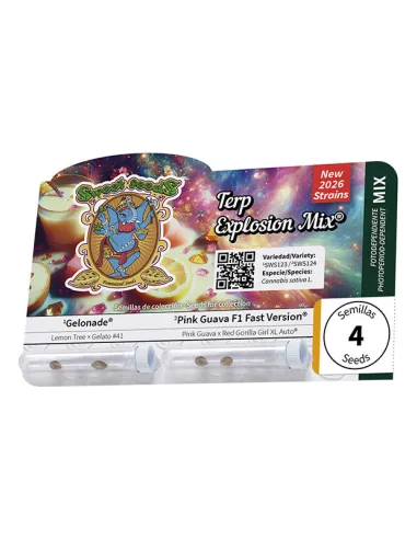 Terp Explosion Mix® fusiona dos variedades fotodependientes del más alto nivel: Gelonade® (SWS123) y Pink Guava F1 Fast Version® (SWS124). Hemos reunido los aromas y sabores más intensos del 2026, el perfume de estas variedades debería ser declarado patrimonio sensorial de la humanidad.