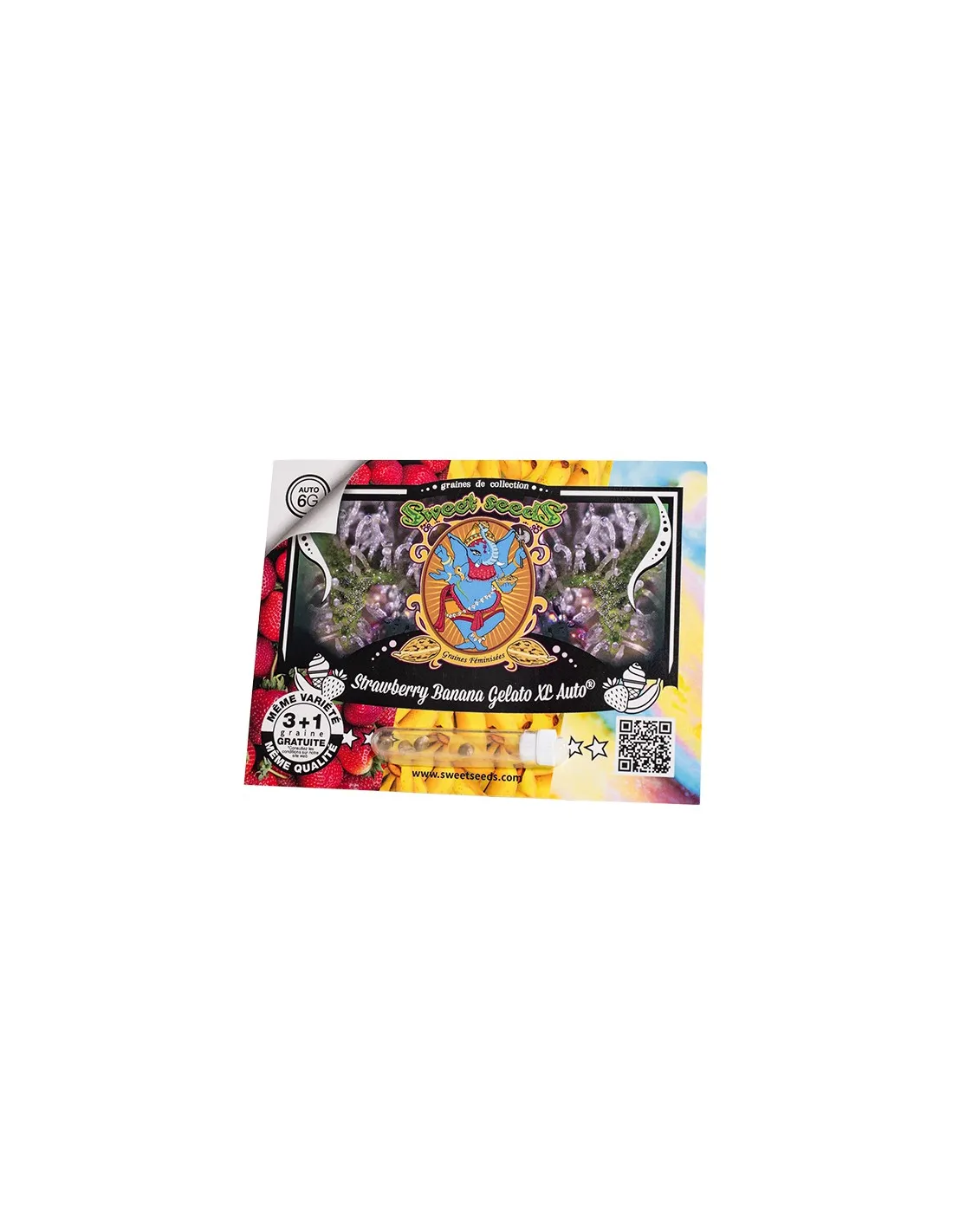 Variété autofleurissante de 6e Génération, résultat du croisement d'un clone élite de Strawberry Banana [Crockett's Banana Kush x Bubblegum (phénotype fraise)] et d'une souche sélectionnée de notre autofleurissante Sweet Gelato Auto® (SWS76).